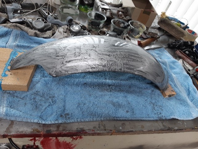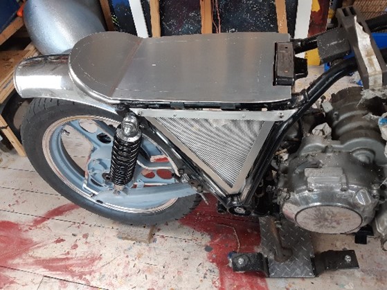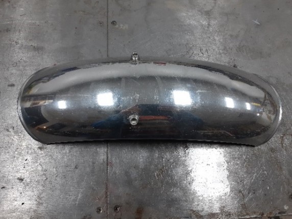 Eerst pas gemaakt. De lip die je aan de linkerkant op de foto zie valt tussen de achterbrug. En om het spatbord een mooie strakke uitstraling te geven moet er weer flink geschuurd en gepolijst worden. Je kunt eigenlijk op aluminium direct met waterproof schuurpapier aan de gang. Van korrel 400 in stappen naar 3000. Daarna met Belgom afwerken en het spatbordje is als een spiegel.