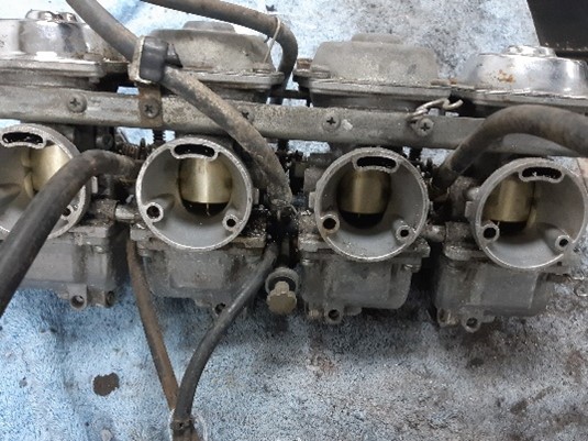Inmiddels de carburateurs van de cilinderpartij losgehaald. En dat ziet er natuurlijk ook weer behoorlijk aangetast uit. Nou ben ik op de bruiloft van de dochter van een goede vriend de buitengewoon aardige Sonny, ook een motorrijder, tegen gekomen. Afin, we kwamen aan de praat over het een en ander en Sonny bood aan de carburateurs ultrasoon te reinigen. Dat is fantastisch natuurlijk. Alhoewel het werk al gedaan is heb ik ze op het moment van schrijven van het verslag nog niet in huis. Op de foto’s zien ze er in ieder geval prachtig uit. Kanniewachte. Sonny bedankt.