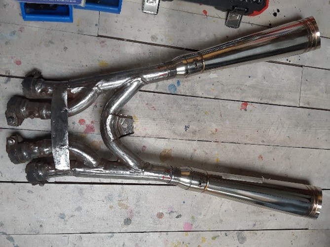 Er moeten nog bevestigingshaken op de collector gelast worden, waaraan de veren van de uitlaten bevestigd worden. Het geluk bij deze collector is dat de pijpen waar de uitlaat op geschoven wordt al enigszins omhoog wijze en dat past goed bij het ontwerp.
