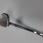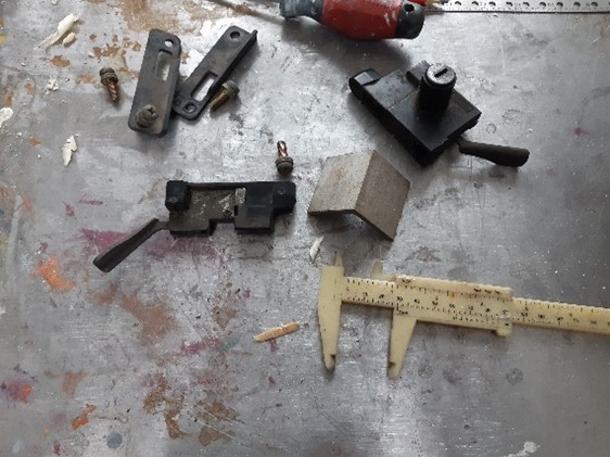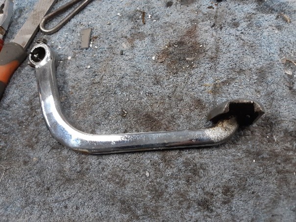 Hoe het rempedaal zo mishandeld is weet ik niet, maar de hele zijkant is er uit. Met hout en opsluiten tussen de bankschroef een heel klein plaatje er in gelast. Vervolgens vijlen en met de ijzerzaag de streepjes en blokjes herstellen en het pedaal is weer in orde. Klaar om bij de verzameling “te verchromen” te leggen.