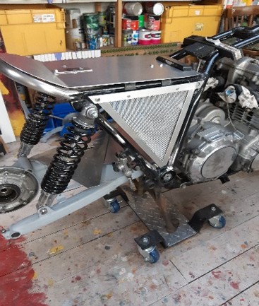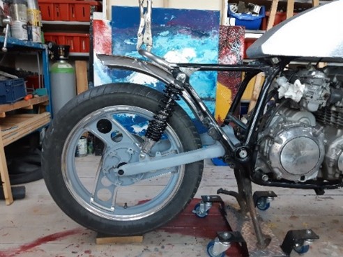 Om te beginnen excuses voor de lange stilte in het verhaal van het project. Nee, het is zeker niet gestaakt. Sterker nog de motor is helemaal klaar. De verslaglegging is wat vastgelopen in verband met emigratie en al wat daar zo bij komt kijken. Maar wees gerust ik maak het verhaal tot en met het op kenteken zetten van de XJ. De motor krijgt een aluminium achterspatbord. De kosten vallen mee maar het spatbord is dof en zit vol krassen. Het overige is prima. Mooie omgezette randen.