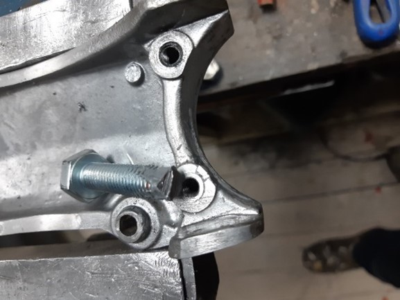 Bij het demonteren van die brug blijkt één van schroefgaten te zijn ingescheurd. Dat moet gerepareerd worden anders gaat de bevestiging niet goed komen. De originele schroefdraad is M6, dus het gat opgeboord naar 9,5 mm. Daarin een schroef M10 gedraaid. Schroef aan het uiteinde met de vijl bewerkt, zodat ie zich zou gaan gedragen als een soort boor. Het materiaal van de brug is aluminium, dus dat werkt goed mee. Dan kan de schroefdraad M10 tegelijk met een 2 componentenlijm erin gezet worden. Dagje laten drogen, draadeind afslijpen en een gat er in geboord van 5,5 en daar weer draad van 6 mm in getapt. Tis even een klusje maar dan heb je ook weer wat. Dan volgt het pas maken van het voorspatbord. Vooral de ronding in het spatbord gaf nogal wat moeilijkheden. Maar uiteindelijk zijn er schuin afgezaagde busjes uit gekomen.
