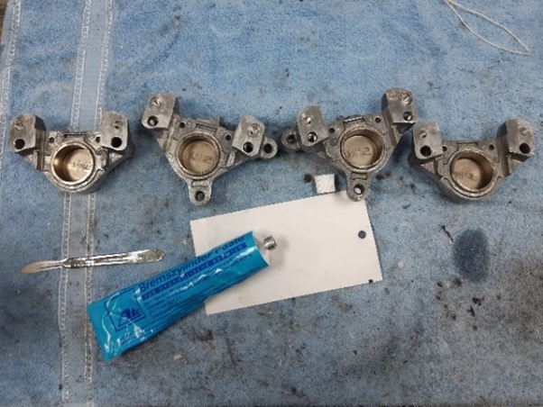 Tussendoor de remcilinders van een nieuw revisiesetje voorzien. De rubbertjes goed ingesmeerd met een speciaal vet, de zuigertjes er in geduwd op de plek en de positie zoals ze oorspronkelijk zaten. De remklauwen worden in elkaar gezet en zijn klaar om in de grondverf gezet te worden. De stoppertjes kunnen de komende kilometers hun zeer gewaardeerde werk weer gaan doen.