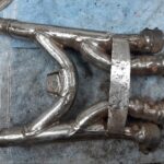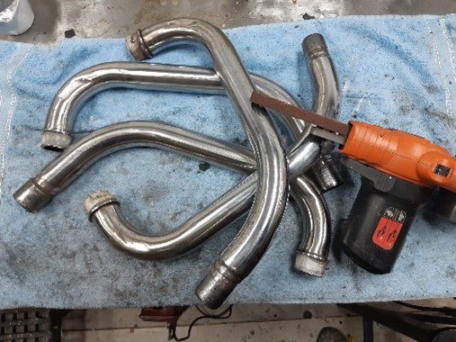 Nu ze toch binnen zijn, nog maar weer eens wat beter op de uitlaatbochten schuren. Die moeten roestvrij zijn om er vervolgens hittebestendige laklagen op te zetten. Er komt immers wrap omheen en daar wil je geen roest doorheen hebben. Het verdeelstuk is wel goed maar ook behoorlijk aangetast, bovendien is het een lastig ding om goed te kunnen schuren.