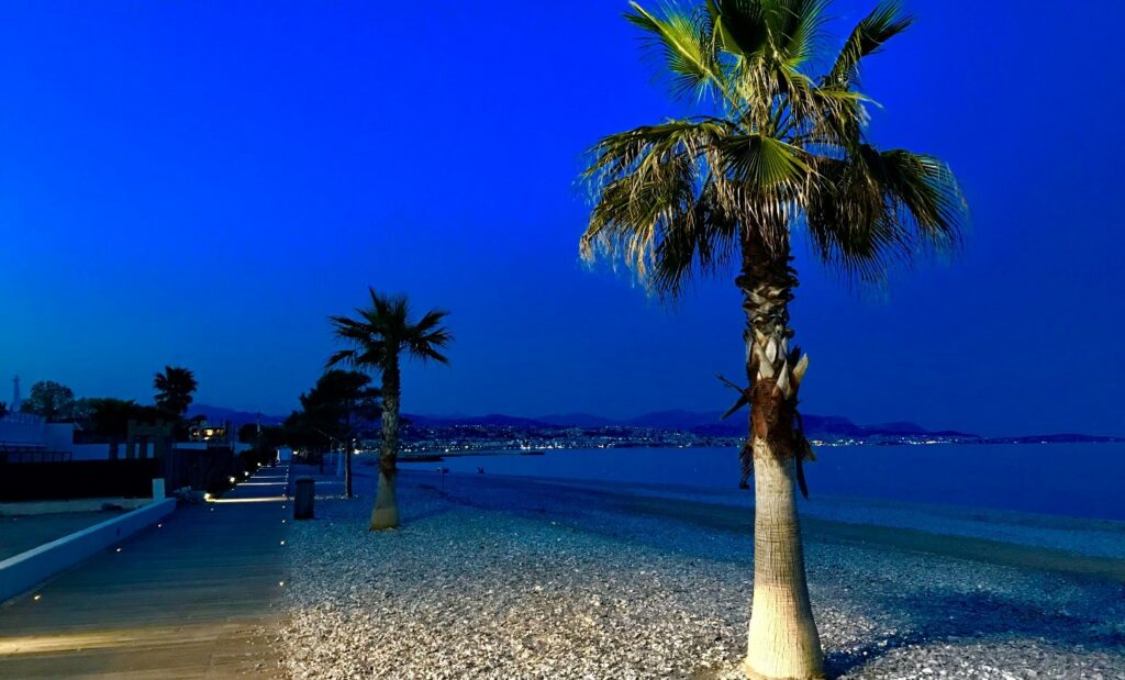 Het strand blijkt voor 80% kiezelstrand. De andere 20% bestaat uit zwerfhout en zand. Rechts in de verte zie ik een heel luxe jacht met de afmetingen van een fregat van de Franse marine voor de baai bij Antibes liggen, links arriveren in hoge frequentie de vliegtuigen met nog ongebruinde toeristen in Nice en steken de besneeuwde bergtoppen boven de huizen uit. Achter mij raast het verkeer op een drukke tweebaansweg en daar weer achter rijdt de trein. Maar …. ik hoor de zee en de zon schijnt en …. ík vind het een fantastisch strandje.