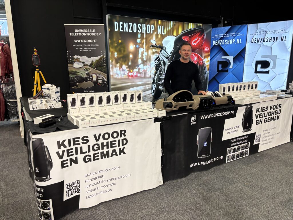 Denzoshop.nl stond met een opvallende stand op deze motorbeurs. Zij leveren o.a. een universele telefoonhouder, waterdicht, voor op de motor. Zo kun je jouw telefoon op de motor gebruiken, ook bij slecht weer. Ze hadden een leuke aanbieding op de beurs.