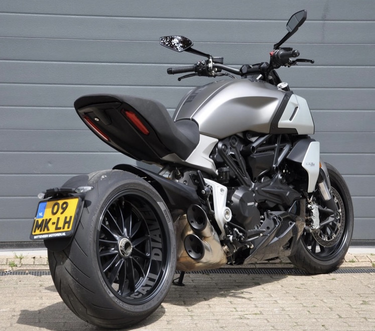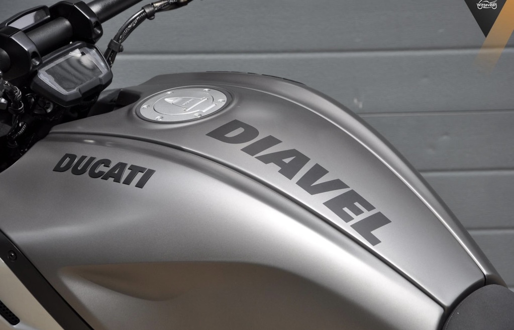 Deze hele dikke, brute Ducati Diavel 1260 waar we nu op de foto’s naar kijken heeft slechts 8250 kilometers op de teller staan. Hij is nieuw in Nederland geleverd, compleet met boekjes, sleutels. En met 159 pk wil hij lekker van zijn plek hoor!