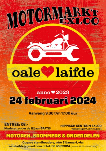 De organisatoren van Oale Laifde hebben op 24 februari 2024 in het Hippisch Centrum te Exloo weer een evenement gepland. Ze zoeken standhouders voor hun evenement, een onderdelenmarkt voor brommers, motors en onderdelen. BSA, Zundapp, Kreidler, vintageborden, helmen, motorkleding, enfin, je gaat er van alles vinden. De grondprijs is 5,00 euro per strekkende meter. De ruimtes zijn 2.5 a 3 meter diep. De kraamhuur bedraagt (exclusief de grondprijs) 25.00 euro en is 4 meter. De motors, brommers en onderdelen hoeven niet allemaal oud te zijn, er mogen ook nieuwe spullen aangeboden worden.
