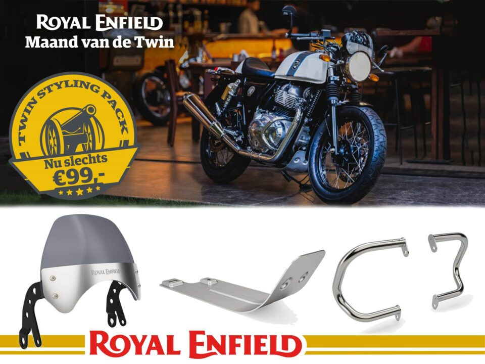 Ter promotie van zowel de Royal Enfield Continental GT 650 als de Interceptor 650 introduceert Royal Enfield het nieuwe ‘Twin Styling Pack’. Het Twin Styling pakket bestaat uit: aluminium beschermbeugels, een windscherm en een chromen skidplate. Normaal wordt dit accessoire pakket verkocht voor € 413,97 incl. BTW. Tijdens de maand van de Twin, in maart 2022, wordt dit pakket aangeboden voor slechts € 99,- incl. BTW. Een korting van ruim 75%!