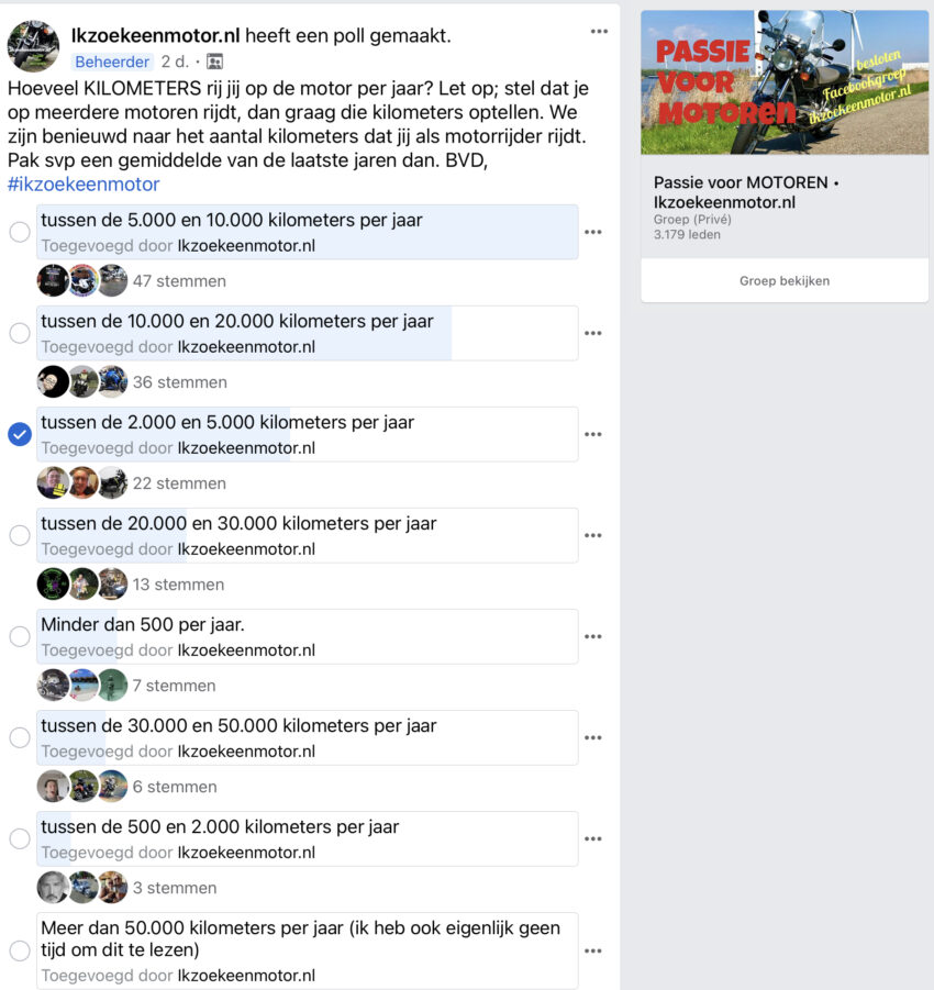 “Hoeveel KILOMETERS rij jij op de motor per jaar? Let op; stel dat je op meerdere motoren rijdt, dan graag die kilometers optellen. We zijn benieuwd naar het aantal kilometers dat jij als motorrijder rijdt. Pak svp een gemiddelde van de laatste jaren dan. BVD, redactie.”