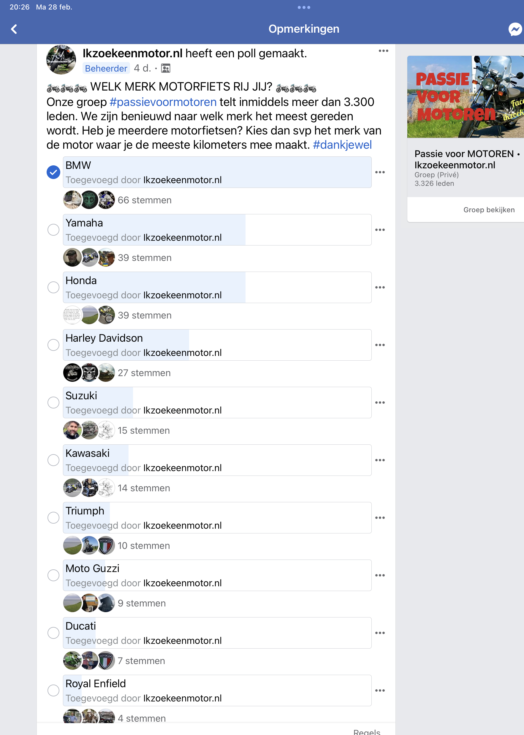 Bij de start van deze website, hebben we, naast de gewone Facebook fanpagina ook een besloten groep opgericht op Facebook, met de naam PASSIE VOOR MOTOREN. Inmiddels hebben we daar bijna 3.200 leden. Een gezellige club mensen, veelal motorrijders, die berichten, foto’s en filmpjes delen vanuit hun hobby. Soms doen we daar een onderzoekje. Natuurlijk beseffen we dat je met dit soort onderzoeken, ‘binnen je eigen parochie’ geen conclusies mag trekken over landelijke cijfers, maar goed, je ontdekt vaak toch op een leuke manier waar de interesses liggen en hoe het gedrag van de motorrijder is. Zo stelden we een paar dagen geleden deze vraag: