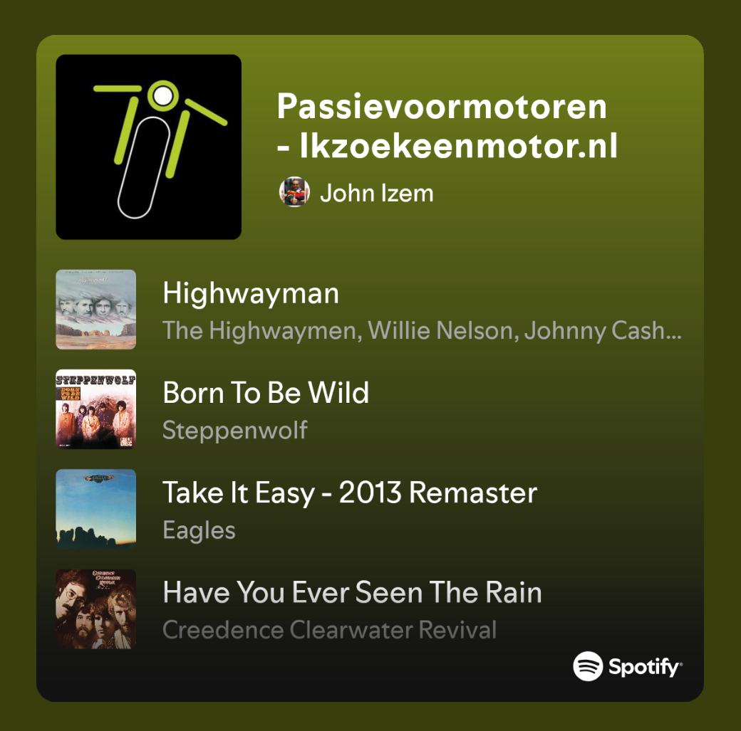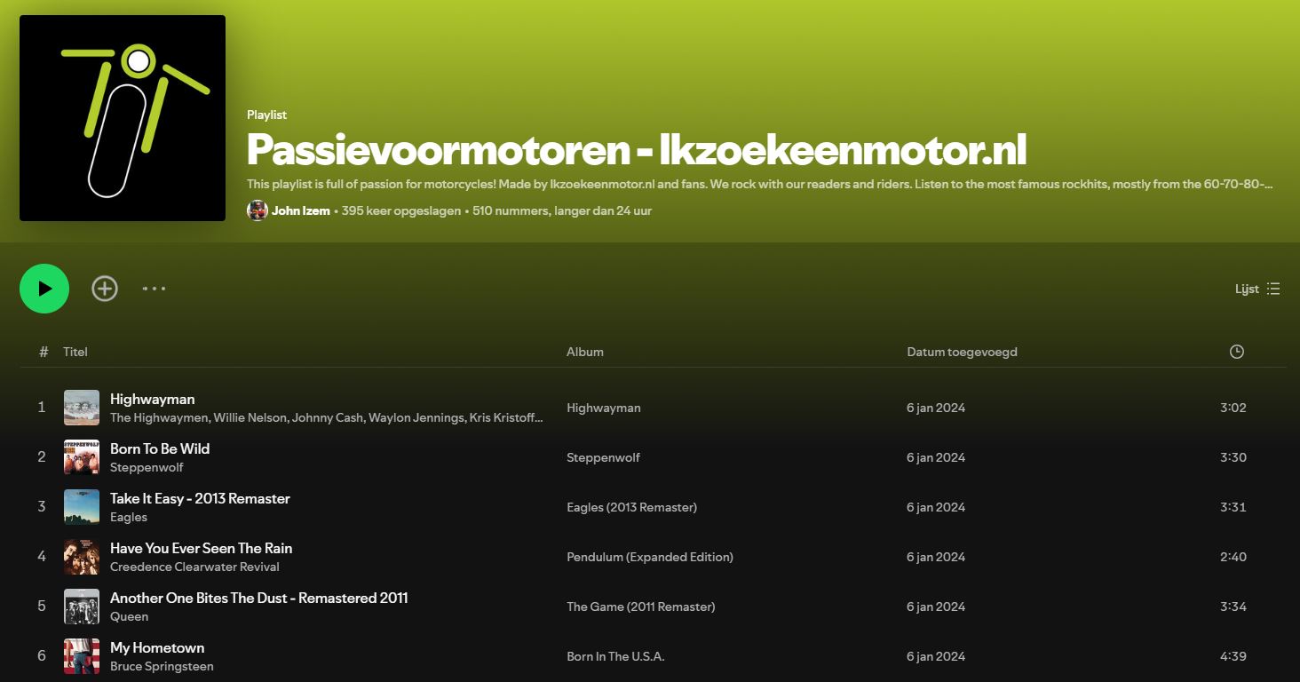 We gaan lekker los op Spotify! Inmiddels hebben we meer dan 35 uur motormuziek. Of noem het gewoon een lijst met lekkere muziek, veelal uit het einde van de vorige eeuw. Onze playlist op Spotify is inmiddels al 400 keer opgeslagen.