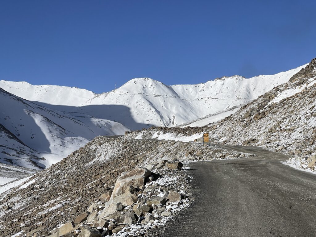 De weg naar de top is aanvankelijk goed van kwaliteit, maar het laatste stuk, dat twee jaar geleden nog geasfalteerd zou zijn, is weer een zandpad met keien en natuurlijk haarspeldbochten. Dat zijn, als het asfalt weer verdwenen is, extra uitdagingen als je handen niet meer goed meewerken door de kou. De zuurstofspanning is erg laag boven op de pas, dus je kan er ook niet erg lang blijven als laaglander.