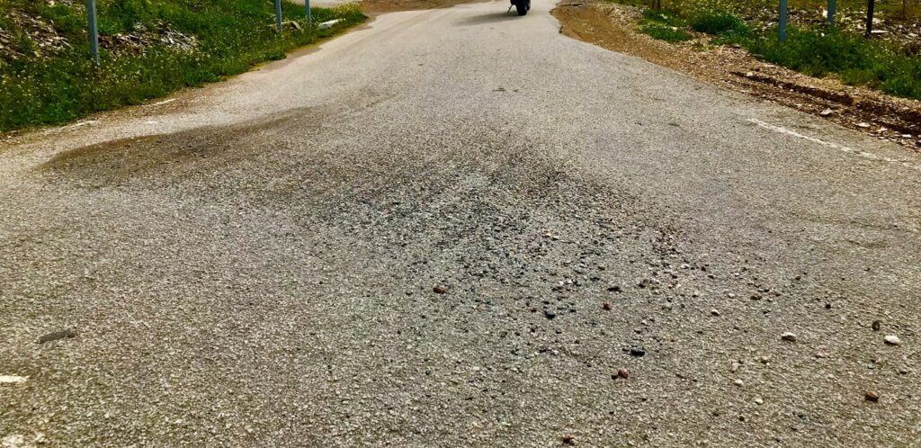 Op veel plekken liggen hopen kiezels op de weg. Ik moet hier goed kijken hoe snel ik de bochten neem. Het gaat tien keer goed en dan ligt plots het verraad in losse stenen op de loer. Maar het is en blijft een prachtig gebied met adembenemend veel groen.