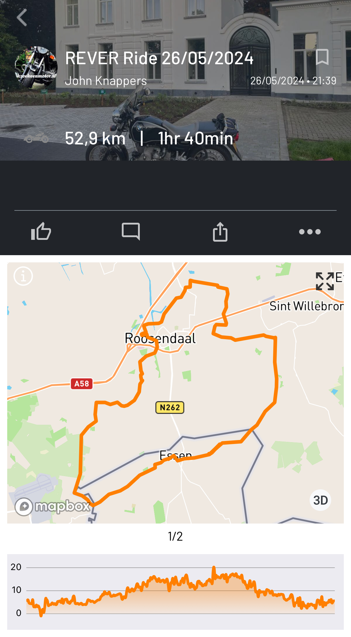 Afgelopen zondagavond. Na een regenachtige dag werd het in de avond ineens lekker weer. Ik vind het heerlijk om in de avond even een uurtje te rijden. “Even tanken”, zeg ik dan. En dan ga ik met een omweg naar Horendonk (Essen). Meestal maak ik dan een motorritje van tussen de 50 en 70 kilometer. Ik rij bijna altijd zonder navigatie maar dan track ik de route via de Rever App.