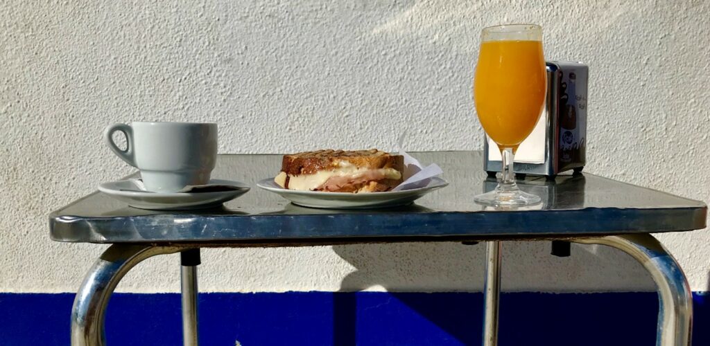 Als ik weer in de bewoonde wereld kom, is het al na 14:00 uur. En zijn de supermarkts dicht. Ik stap bij een café naar binnen voor iets eetbaars. De baas heeft er geen zin meer in, maar samen met een Frans sprekende Portugees lukt het om een fantasielunch te ritselen. Heerlijk! Buiten vergapen de locals zich aan mijn motor. Mijn BMW glimt van trots…
