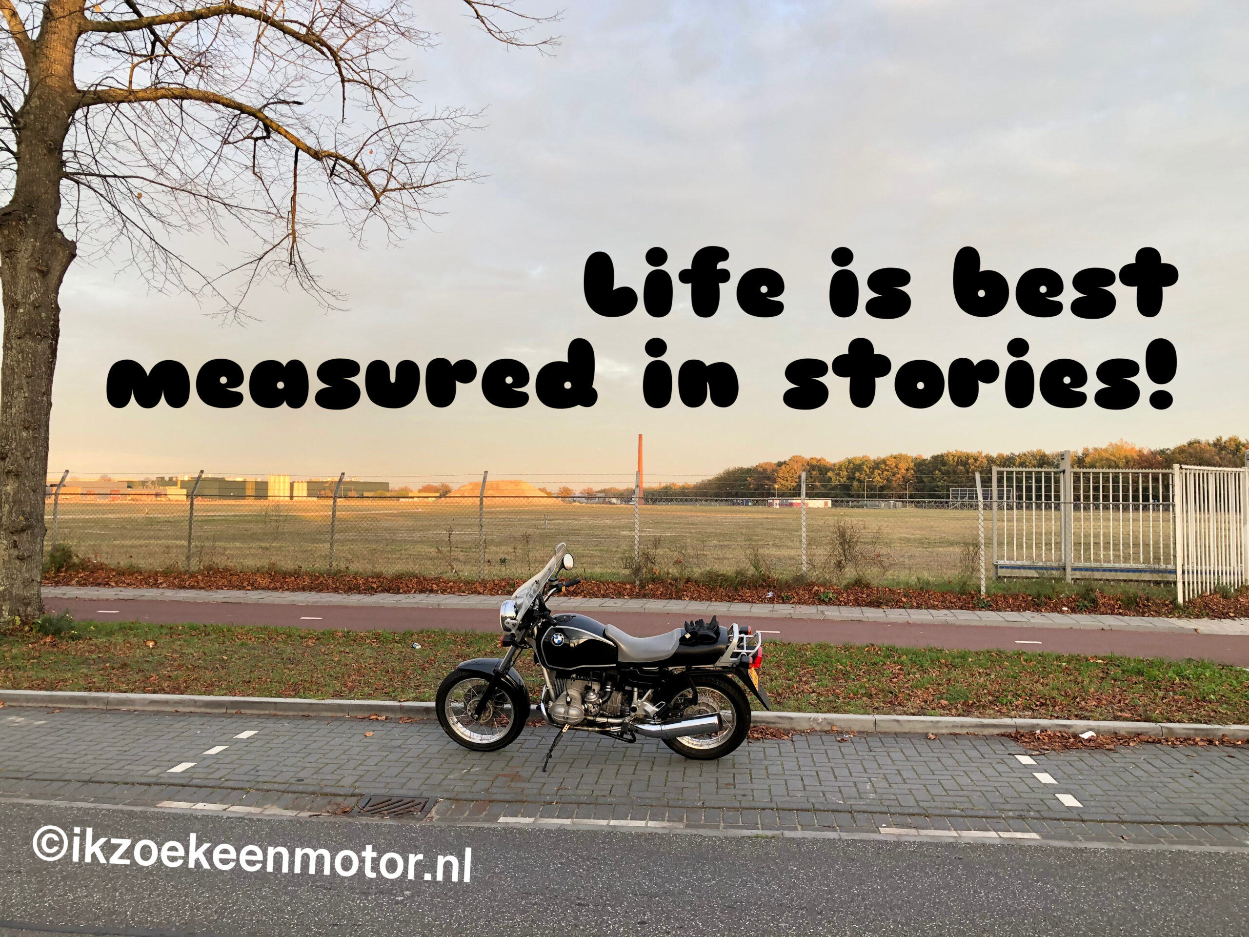 Als je als motorrijder onderweg ergens stopt dan ontmoet je heel vaak mensen. Vaak is je motorfiets een ontstaan van het gesprek en wordt een verhaal geboren. Ergens op de sociale media kwamen we deze spreuk tegen. Hij bleef hangen. We rijden motor en bouwen aan dit platform van en voor motorrijders. We delen verhalen. Motorverhalen. Dus vanzelf plakten we de spreuk aan een plaatje. De BMW R80R uit 1993 staat hier overigens geparkeerd in de Zwaanhoefstraat in Roosendaal ergens waar ooit de hoofdingang van de Philips fabriek was. In de verte zie je de schoorsteen die men verplaatst heeft tot naast de snelweg. De tekst hebben we in de lucht gehangen. Want rond deze locatie hangen voor heel wat Roosendalers weer verhalen. Van gloeilampen tot TL-buizen.